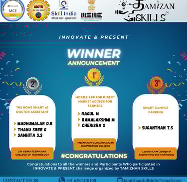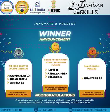 Innovate & Present was a dynamic student-driven event organized by Tamizhan Skills to encourage innovation, problem-solving, and impactful presentation skills. Participants were invited to identify real-world problems and pitch their creative solutions.